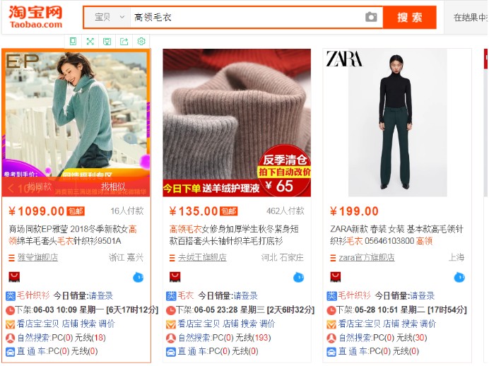 很明显,是中间一张,因为消费者搜索的是【高领毛衣】,他希望看到的是一条高领的毛衣,虽然以上三个产品标题都有【高领】,但是只有中间的主图展示了高领,其他两张只是简单的展示产品的款式,很明显不符合消费者第一需求。