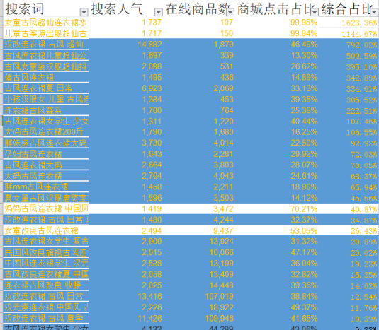 所以我们想要做标题优化时,就先确定核心词。但核心词,可不只有一个,古风连衣裙,也可以叫做汉改连衣裙、复古连衣裙、中国风连衣裙。各个地方叫法不同,标题要就尽可能覆盖用户的需求,少一个核心词就少一部分市场。